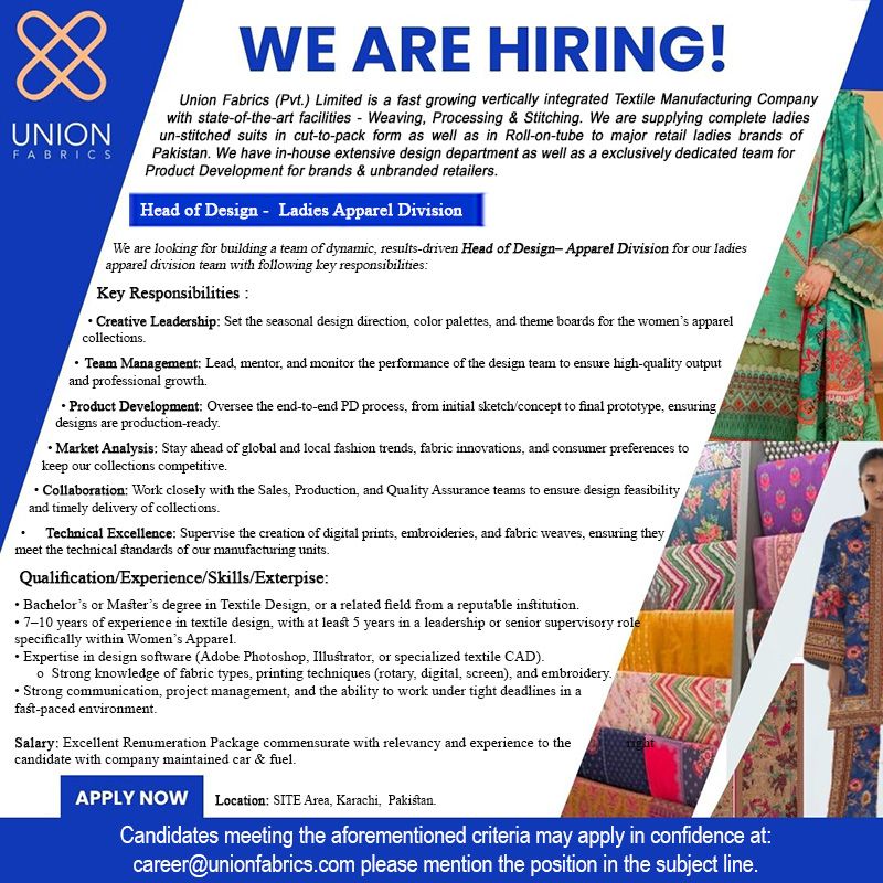 Union Fabrics Pvt Ltd Jobs Head of Design: