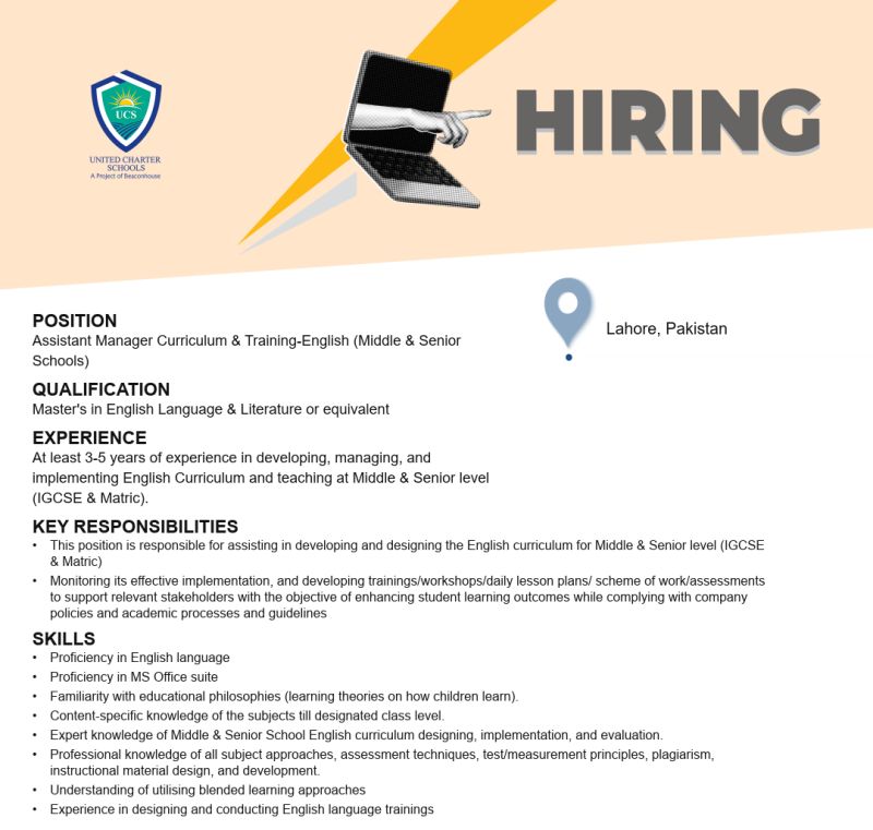 Position: Assistant Manager Curriculum & Training-English (Middle & Senior Schools)