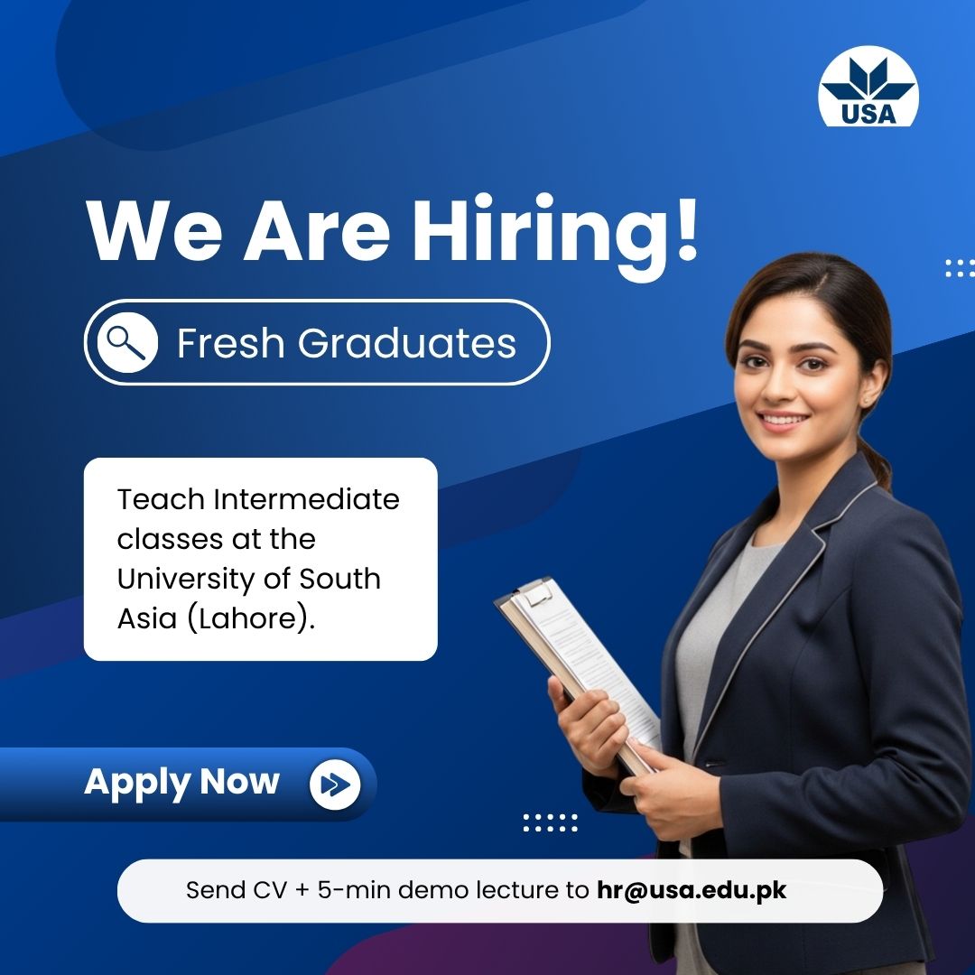 The University of South Asia is hiring talented Fresh Graduate Teachers to teach Intermediate students. This is the perfect opportunity for those who are not only academically strong but also confident, engaging, and ready to shine in the classroom.