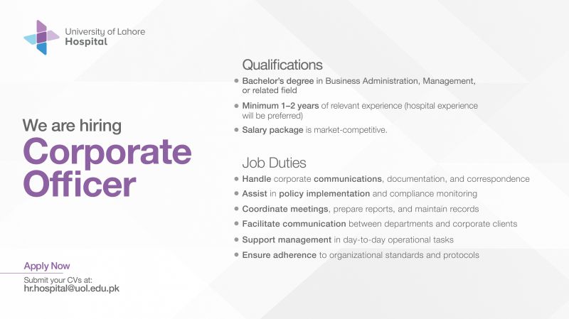 Join the University of Lahore Hospital and play a key role in supporting organisational operations and ensuring seamless communication across departments.