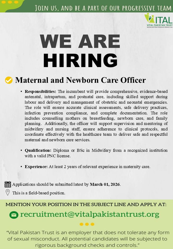 VITAL Pakistan Trust invites applications for the position of Maternal and Newborn Care Officer.