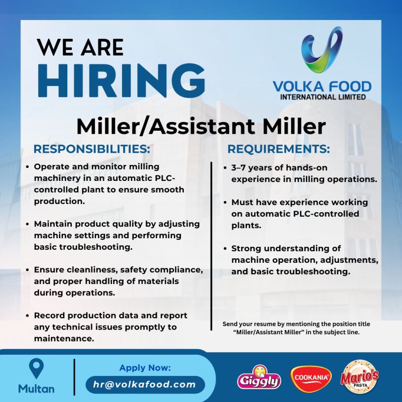 • Note: Send your resume by mentioning the position title “Miller/Assistant Miller” in the subject line.