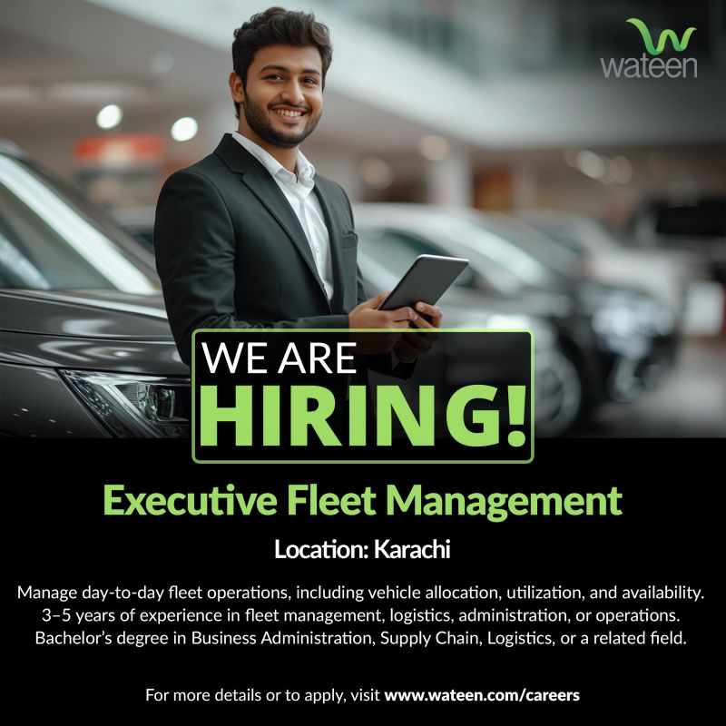 Wateen is hiring an Executive – Fleet Management to oversee and optimize fleet and administrative operations in Karachi.