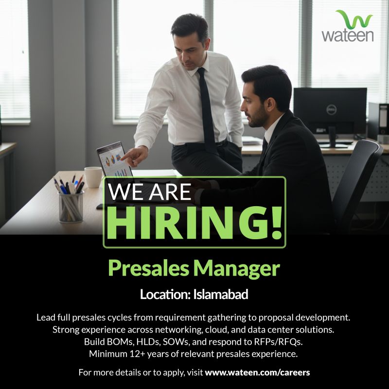 Wateen is looking for an experienced Presales Manager in Islamabad to lead the presales function, manage a technical team, and uphold high standards of customer documentation and client-facing communications.
