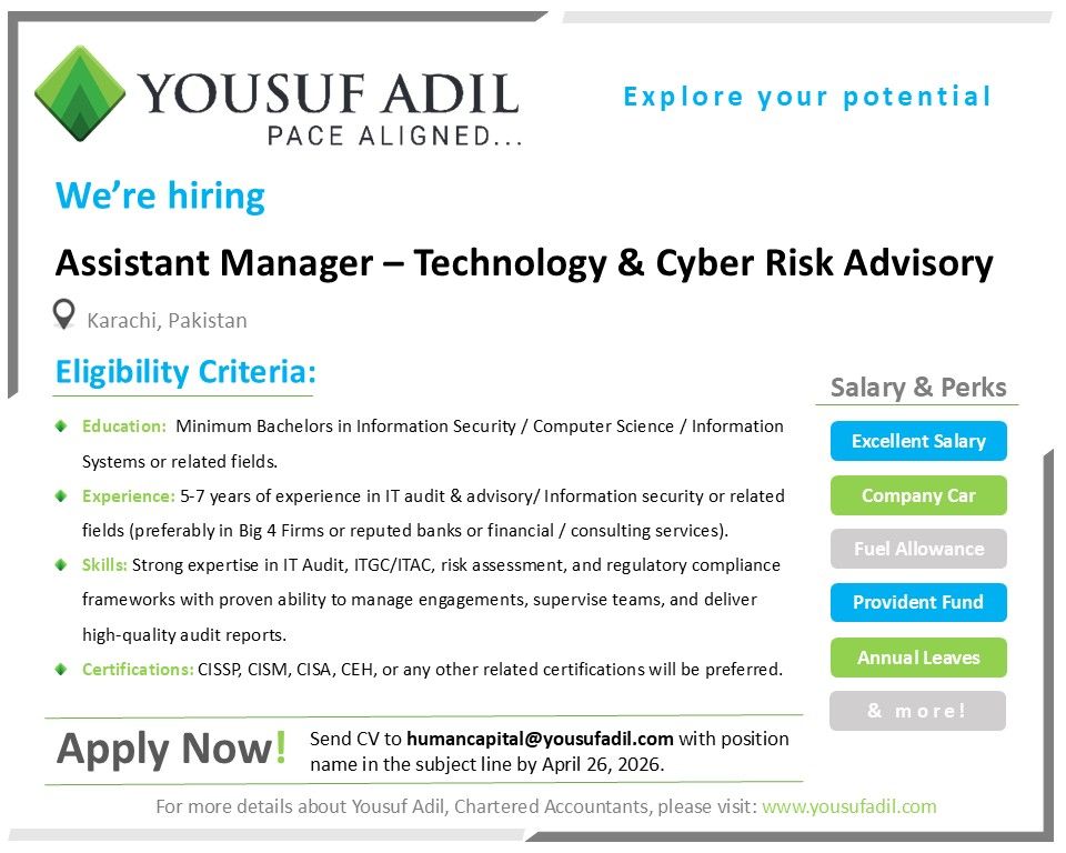 Yousuf Adil, Chartered Accountants is hiring for the position of ‘Assistant Manager – Technology & Cyber Risk Advisory’ for Karachi Office. Candidates with related experience are encouraged to apply with confidence at the earliest!