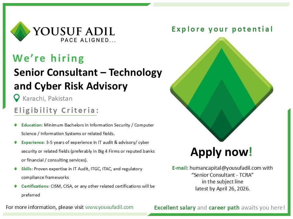 Yousuf Adil, Chartered Accountants is hiring for the position of ‘Senior Consultant – Technology & Cyber Risk Advisory’ for Karachi Office. Candidates with related experience are encouraged to apply with confidence at the earliest!