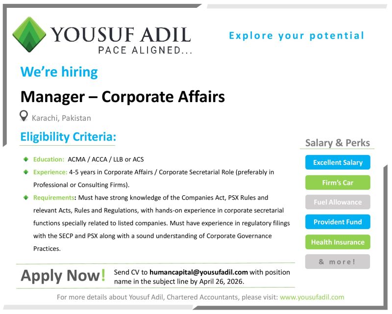 Yousuf Adil, Chartered Accountants is hiring for the position of ‘Manager – Corporate Affairs’ for Karachi Office. Candidates with related experience are encouraged to apply with confidence at the earliest!