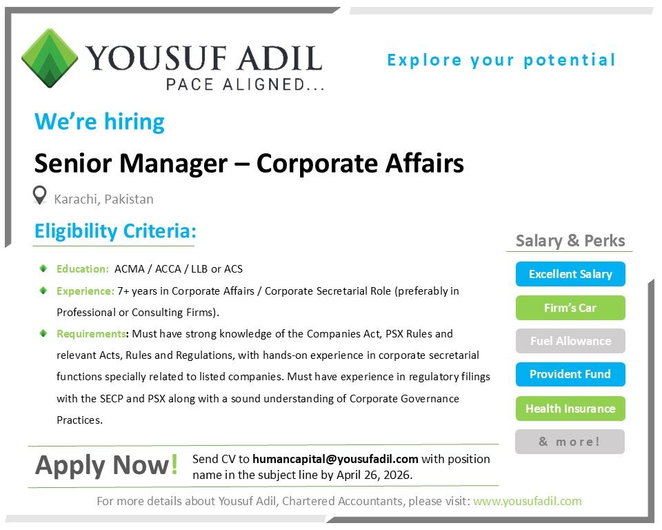 Yousuf Adil, Chartered Accountants is hiring for the position of ‘Senior Manager – Corporate Affairs’ for Karachi Office. Candidates with related experience are encouraged to apply with confidence at the earliest!