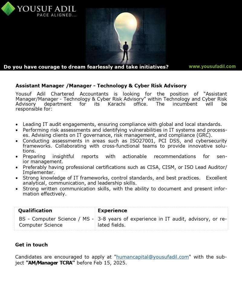 Yousuf Adil Chartered Accountants is looking for the position of “Assistant Manager/Manager – Technology & Cyber Risk Advisory” within Technology and Cyber Risk Advisory department for its Karachi office. The incumbent will be responsible for: