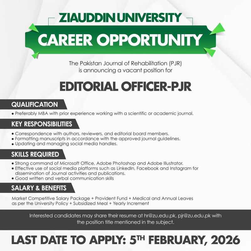 Ziauddin University Jobs Editorial Officer PJR: