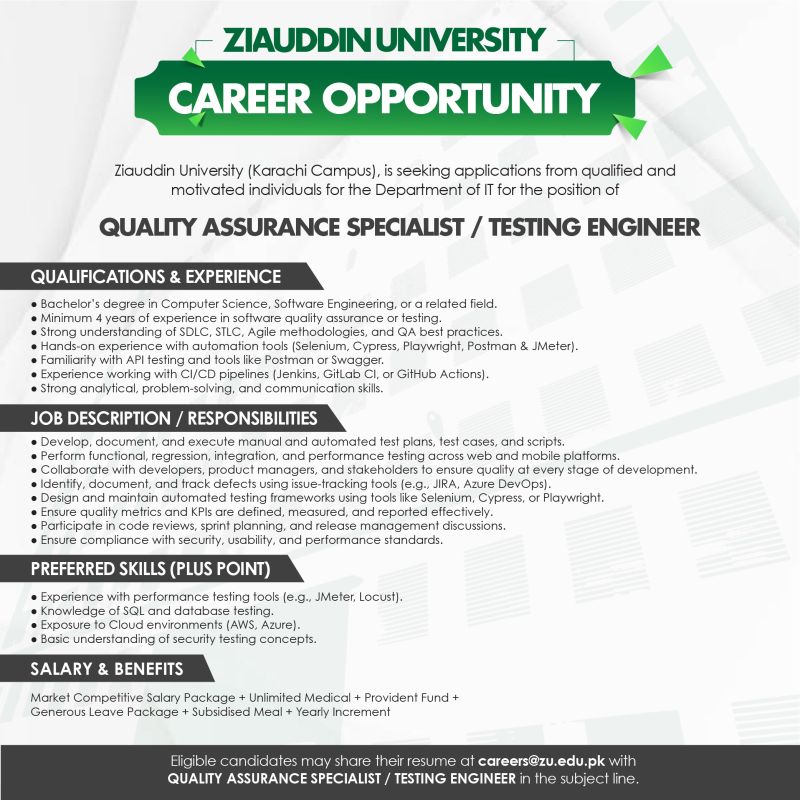 Ziauddin University (Karachi Campus), is seeking applications from qualified and motivated individuals for the Department of IT for the position of: