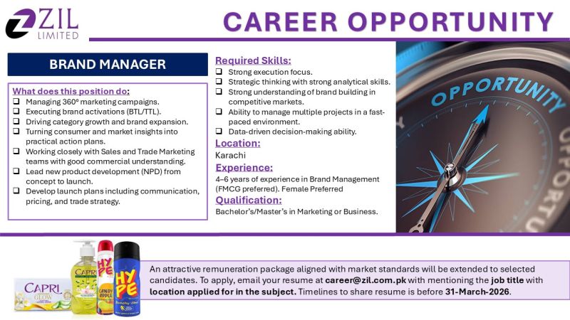 ZIL Limited is on the lookout for passionate and driven individuals to join our team as Brand Manager, Karachi.